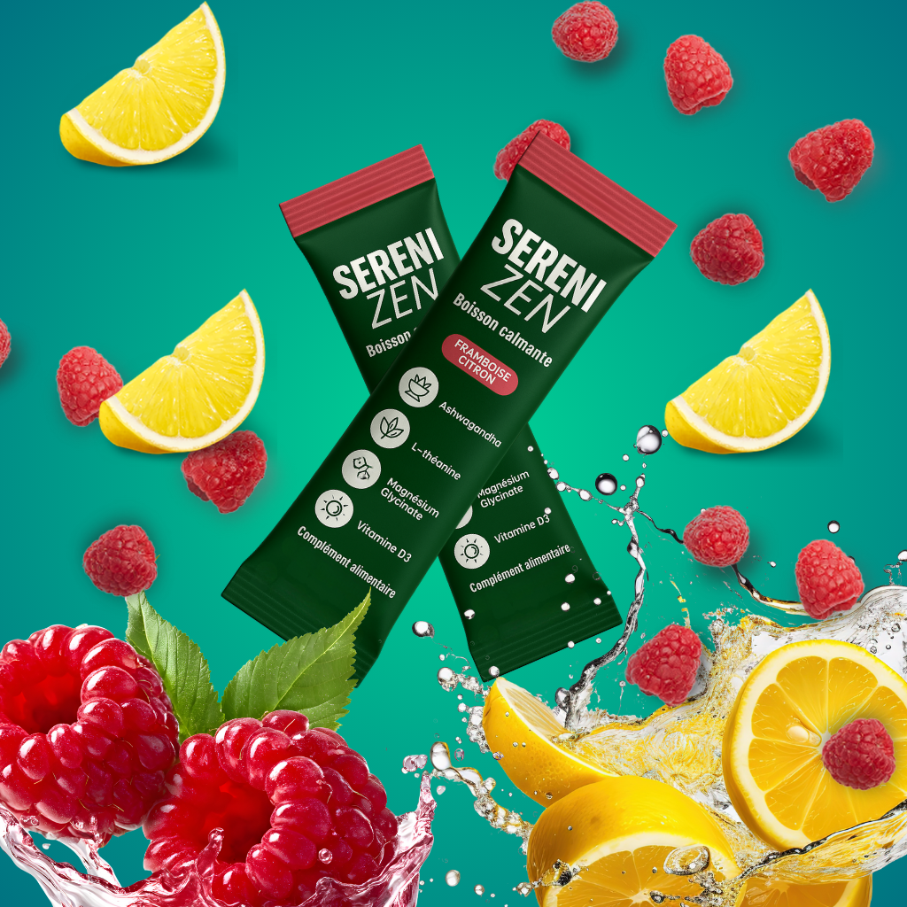 Avec son délicieux goût citron/Framboise SERENI ZEN se glisse parfaitement dans un verre d’eau.. Un vrai moment plaisir dans votre routine.